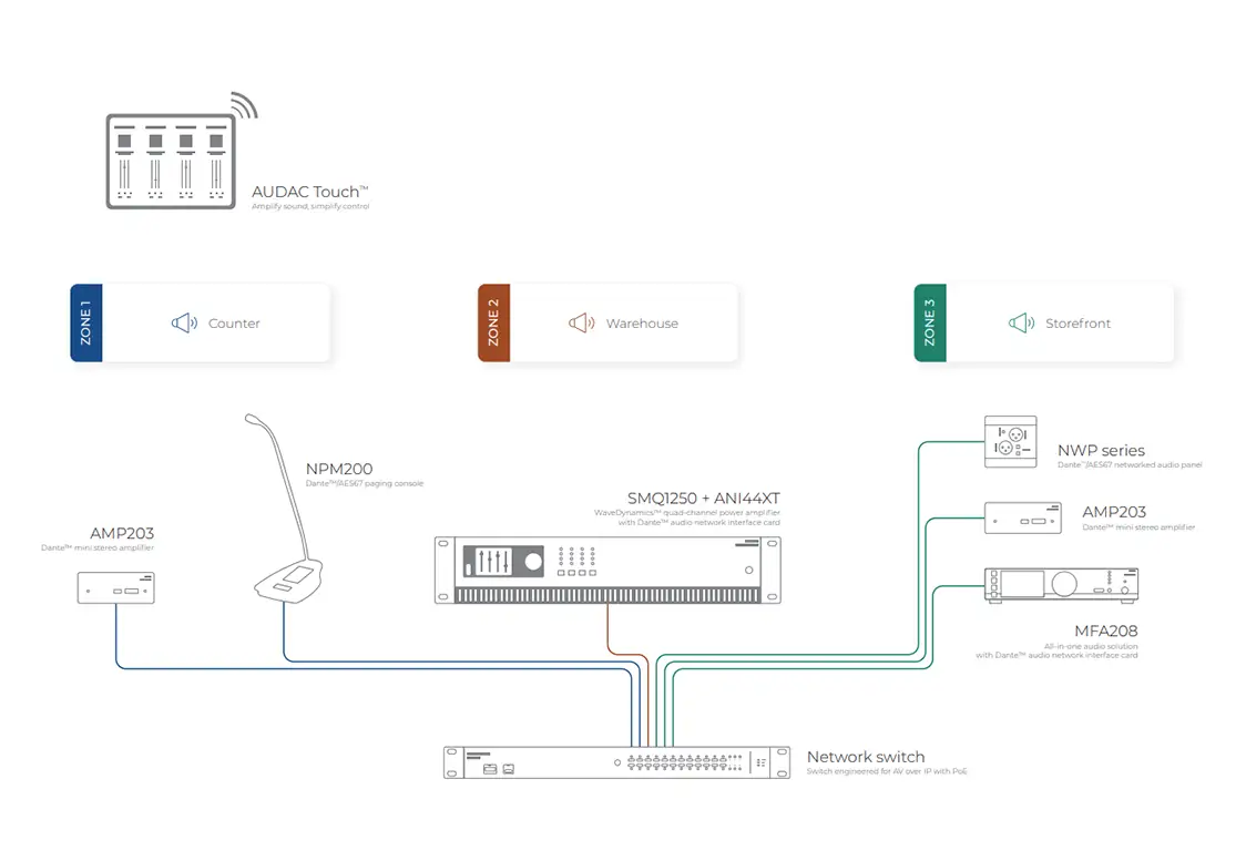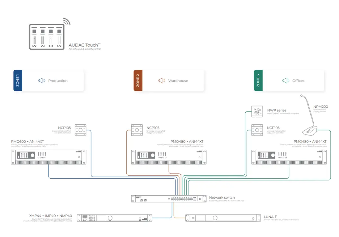 Luna-F är designad att fungera sömlöst med Audacs Dante-kompatibla bordspaneler (utropsmikrofoner) och NWP-serien av nätverksanslutningspaneler. Bygg ett komplett, flexibelt system som kan växa från en liten installation till en komplex multirumsanläggning utan att byta plattform.