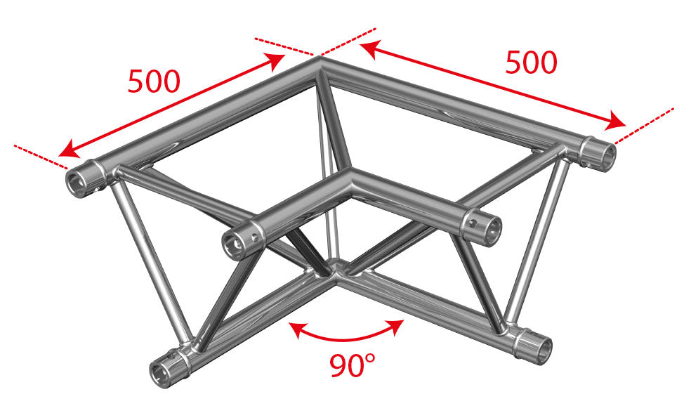 Skapa rena 90-graders hörn i din trusskonstruktion med detta 2-vägs hörn för trekantstruss. Perfekt för att bygga fyrkantiga ljusbroar, scenkonstruktioner och installationer där du behöver ändra riktning med precision och stabilitet.